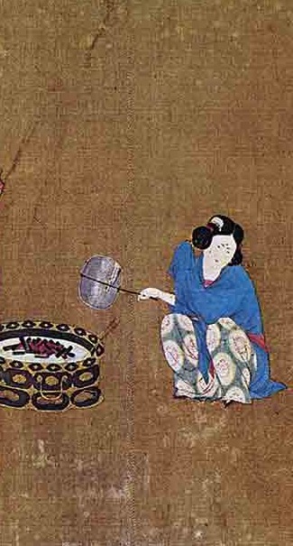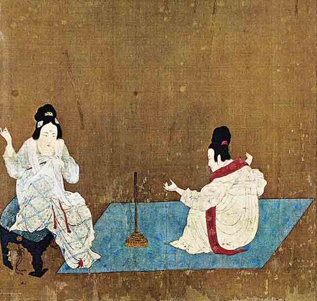 Esta bella pintura titulada «Damas de la corte preparando seda recién tejida«, nos muestra a un grupo de damas chinas de alto rango ocupadas en la elaboración de delicados tejidos de seda, en el siglo VIII d.C. Está realizada sobre seda, pintada con vivos colores y con un lujoso fondo dorado. Aquí la vemos separada en cuatro partes. Se conserva en el Museo de Bellas Artes de Boston.