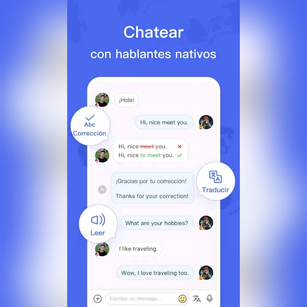 Es una aplicación similar a Whatsapp, donde chatear con personas nativas del idioma que se está estudiando.